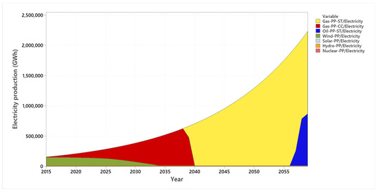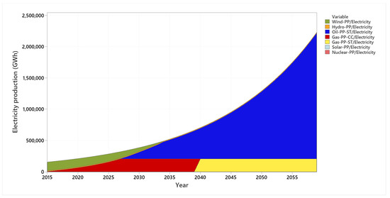 Figure 7 shows the electricity production of the second scenario. In this scenario, we assumed constraint on the CO2 emission from gas power plant. The average contribution of gas power plants will reduce to 30%, while the average contribution of oil power plants will increase to 48.6% by 2060. The contribution of wind, solar, and hydropower plants towards electricity generation remains unchanged.