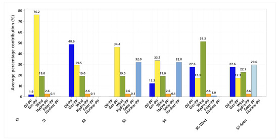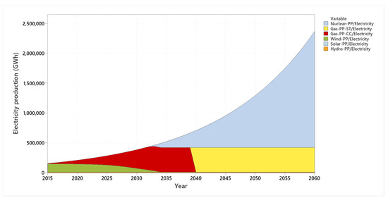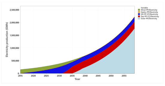 Figure 11 presents the second case of the fifth scenario, in which solar energy dominates. To accomplish this conclusion, we assumed that the investment cost of solar technology is cut in half from the initial cost as shown in Table 2. Over 45 years, the average contribution of solar technology is projected to increase to 29.6% while wind technology is projected to contribute 22.7%.