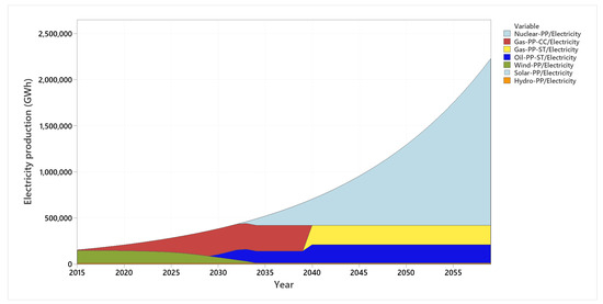 Previous studies that employed the model for energy supply strategy alternatives and their general environmental impacts (MESSAGE) code to develop long-term energy plans for optimization have been conducted in different countries. Syria used the MESSAGE tool to devise the best long-term energy supply strategy. Syria’s future energy and electricity demand was projected based on a variety of scenarios that reflected its future socioeconomic and technological development trends over the next 30 years [10]. The results from that study revealed that primary energy will increase at an average annual rate of 4.8% to 68 Mtoe by 2030, and the total installed capacity will optimally increase from 6885 to 19,500 MW by 2030. The study further predicted that the future national energy system will mainly depend on oil and NG with limited renewable energy and nuclear power contributions at the end of the research period to guarantee supply availability. The adoption of nuclear power was determined to be the best long-term electric-power strategy for Saudi Arabia [11]. The study confirmed that Iran, the United Arab Emirates, Egypt, and Jordan were likely to adopt nuclear technology but categorized Saudi Arabia as a “nuclear-power state” and did not directly mention specific nuclear-power development plans. Using the MESSAGE code, the authors predicted that Saudi Arabia will be expected to experience power shortages by 2025, and these shortages will last up to 2035 when the existing power plants will be restored. The model projected that renewable and nuclear power technologies will be the most competitive future strategies for Saudi Arabia’s power supply by 2050. An analysis of the long-term energy plan for Korea using MESSAGE for energy optimization was conducted to compare three scenarios: the current existing scenario, strengthening the low-carbon power mix, and expanding renewable-energy sources to assess long-term energy plans. The results indicated that nuclear and coal power generations were reliable energy sources, and they were the primary energy sources in the three scenarios. However, coal power plants may not be ideal as potential energy sources because of the recent policy changes around the world that promote low-carbon and environment-friendly energy sources [12].