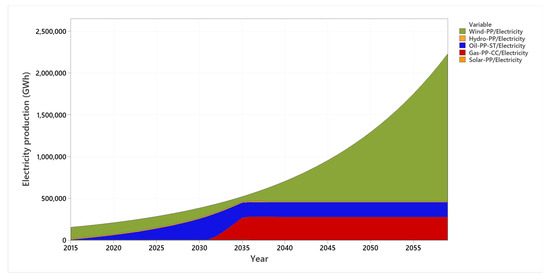 Figure 6 shows the electricity production of the first scenario. There is no limitation on CO2 emission and no constraint on electricity production from fossil fuel. It shows that gas power plants, gas power plants with steam turbine, and gas power plant combine cycle are predominantly used to generate electricity to meet the final electricity demand in the system. Over 45 years, the average contribution of gas power plants and wind energy is projected to be 76% and 19%, respectively. In 2060 the contribution of gas power plant is projected to decrease by 61% and the oil increase to 38.5%. Whereas there is projected to be no contribution of nuclear power plants and a slight annual contribution from hydropower plants of approximately a 2.6% average.