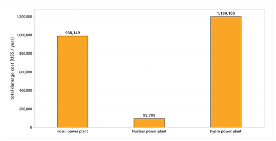 Figure 13 shows the total damage cost due to the electricity-generation technologies from the Burullus fossil fuel, Aswan High Dam hydro, and El Dabaa nuclear power plants during normal operation. Furthermore, the total damage cost of the fossil fuel is represented by the sum of the damage costs of health and agriculture effects. The total damage cost of the nuclear power plant is equal to the sum of fatal cancer, non-fatal cancer, and specific hereditary disease costs, whereas that of the hydropower plant is equal to the sum of the losses in farmland and agricultural/livestock production as well as the emission damage cost. Additionally, the damage cost is directly related to the environmental effect with respect to the exposure risk factor where higher or severe exposure results in higher risk or effects. Figure 13 illustrates that the hydropower plant yields the highest damage cost because of the large area inundated by water. The damage cost considers the losses in the agricultural and livestock production in this large area. The agriculture loss incurs the highest value, which explains the reason why hydropower plants have the highest total damage cost. The nuclear power plant exhibits the lowest damage cost during normal operation; however, the cost of a power-plant accident is not considered in our calculation. Therefore, the nuclear power plant can be considered to be the best alternative choice for electricity-generation technology from the perspective of environmental effect.