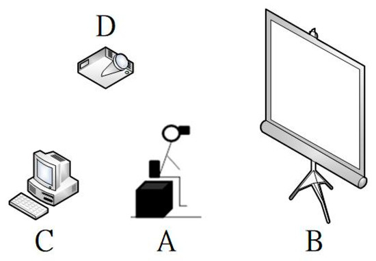 Experimental setup ((A) eye tracker, (B) projection screen, (C) investigator control computer, (D) projector).