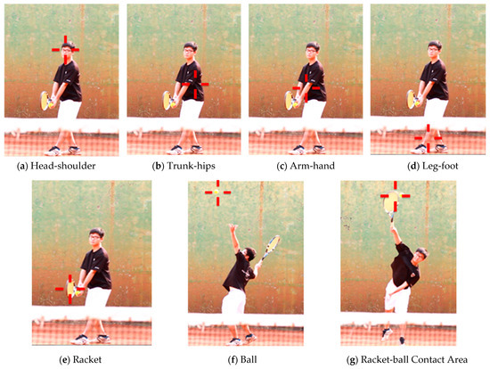 Gaze positions: the gaze positions in video image of the scene are based on the seven more important gaze positions suggested by a past study [5]: (a) head–shoulder, (b) trunk–hips, (c) arm–hand, (d) leg–foot, (e) racket, (f) ball, (g) racket–ball contact area. The items listed above are named as regions of interest (RoIs); the seven RoIs of a player’s body were classified using a “cross cursor” (in Figure 2) for this study [27].