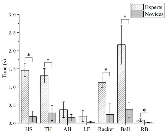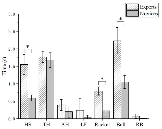 Gaze time for different positions during a backhand shot for different skill level tennis players. HS: head–shoulder, TH: trunk–hips, AH: arm–hand, LF: leg–foot; RB: racket–ball. *: Statistically significant difference between experts and novices.