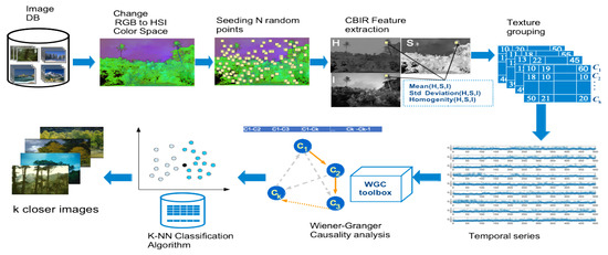The training stage in the proposed methodology is presented in Figure 3. It includes the image database reading, the change of color space, the random points selection, the attributes extraction, the auto-grouping, the time series generation, the causality calculation, the classification-recovery of the k-next images, and finally, the most similar natural scenes are shown.