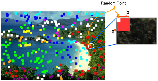 Figure 5. Image with random points, each one generating a neighborhood size pixels. - CBIR feature extraction: In each neighborhood, three CBIR features are extracted, that are mean, standard deviation, and homogeneity in the three layers of the HSI color space. This appears in a CBIR features vector, for an image a matrix size is created. Where is the number of random points and are the extracted CBIR features.