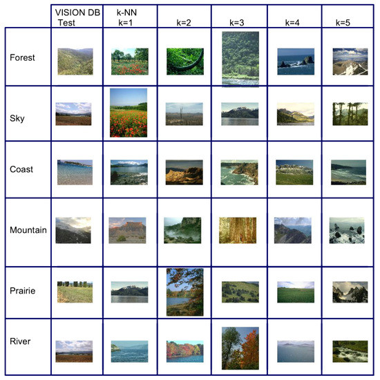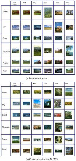 As can be seen in Figure 7a,b, the search or query image is recovered along with the 5 more similar images.The proposed methodology gives 100% result if the the recovery of the most similar image is taken into account in the resubstitution method. In contrast, for the cross-validation method, the five recovered images belong to the same type of natural scene.