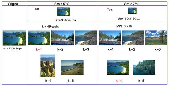 Figure 8 shows the queries result of an image with a percentage reduction of and . In the confusion matrix, the recovery in the query image is achieved within the 5 closest images given in Table 3.
