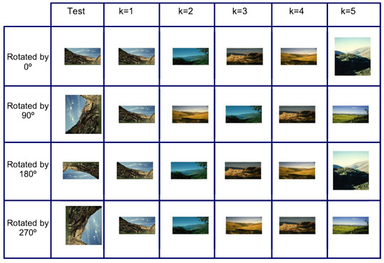 An important test in this proposal is the rotational invariance of the natural scenes. Since the images can be taken from a drone, light aircraft, helicopter, satellite, etc., the images can be acquired rotated at a given angle. Thus, using the scenes from the proposed databases, In Figure 9, it can be seen that the query image is within the most similar image. Although the five most similar images are sought, the image firstly recovered is the image sought. The confusion matrix result for the rotation tests is given in Table 3.