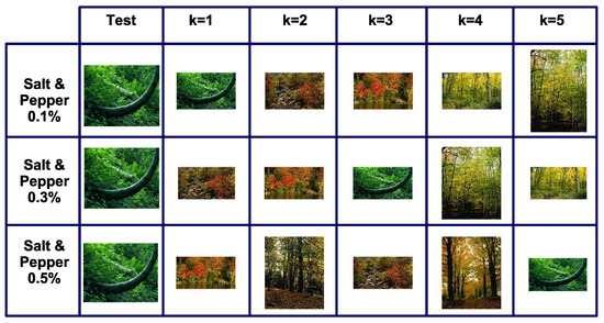 The most challenging tests for the proposed methodology are the images having noise, because the CBIR methodology works directly with the texture, the noise directly affects the CBIR performance. Figure 10 shows the recovery results for three types of images contaminated with salt and pepper noise at , , and , the searched image again appears within the 5 most similar images.The result of the confusion matrix for the noise tests is given in Table 3.