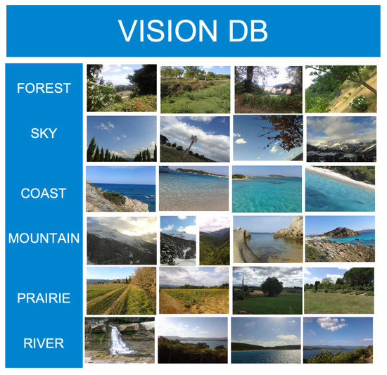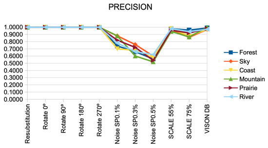 The second set of images of natural scenes (Shullani [16]) taken with cellphone devices was used to test the same methodology as previously defined. Figure 11 shows some natural scenarios such as forest, sky, coast, mountain, prairie, and river. Precision measure was used to determine performance of the proposal, precision measure is defined in Equation (11).