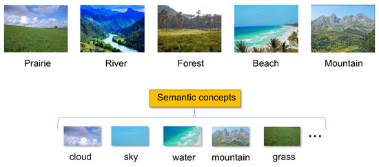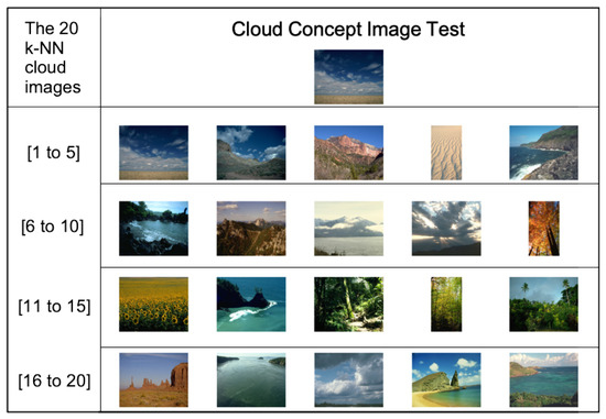 The proposed methodology also allows the searching of natural scenes by their constituent elements, that is, from among all the scenes in the image base, retrieving all the scenes that contain a particular element of the scene (or common element). Figure 14 shows some examples of natural scenes i.e., fields, rivers, forests, beaches, and mountains. In the lower part of the Figure 14, some semantic concepts that constitute the scenes are shown i.e., clouds, sky, water, grass, mountains, etc.
