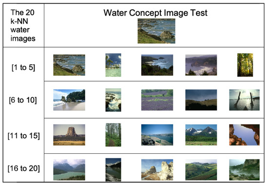 - Water Element: Figure 15 shows an example of recovering natural scenes containing the element water. For the proposed methodology, the type of scene is not important, and only items containing water (sea water or river water) are recovered. Among all the 20 images, only 14 images containing water were recovered.