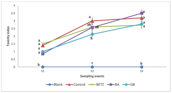 Toxicity symptoms appeared already from the end of the first sampling event, as can be seen in Figure 1. At the end of the second sampling event, significant differences were detected, as GB-treated plants presented lighter toxicity symptoms than Control plants. Nonetheless, at the end of the third sampling event, treatments did not seem to alleviate significantly the toxicity symptoms, although both GB- and BETZ-treated plants had a better overall appearance, based on their toxicity index.