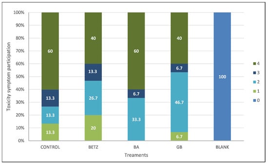 The severity percentage distribution of the symptoms revealed a significant difference (by the Chi-square test), which is shown in Figure 2. Sixty percent of the Control and BA-treated plants presented symptoms on more than 75% of the AGPM, indicating the severe salt stress of the plants. On the other hand, both GB- and BETZ-treated plants responded better, as only 40% of the plants exhibited severe toxicity symptoms.