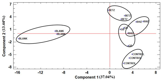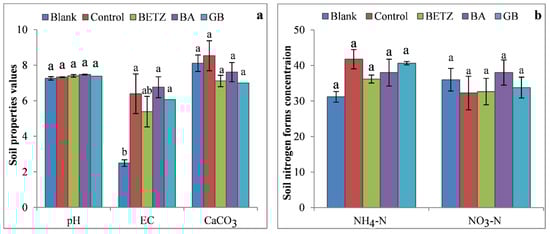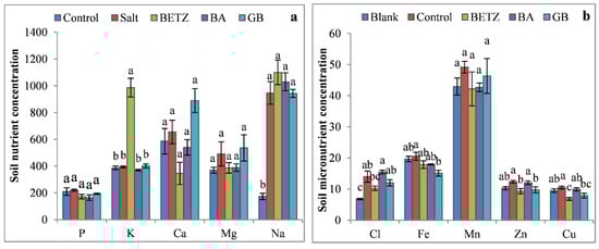 The BETZ treatment also resulted in a high concentration of available K, significantly higher than all in other treatments, which did not differ among each other (Figure 4a). Sodium was detected in high amounts in salt-treated soil (Figure 4a), while significant differences between treatments were detected concerning the concentration of soil micronutrients (Figure 4b). Chloride was found in low concentration in Blank treatment, which did not differ from BETZ treatment. On the other hand, Fe was found to be in high concentration in the Control, higher than that determined in GB treatment. Control and BA treatments resulted in a high concentration of Zn in the soil, higher than that determined under BETZ and GB treatments. Copper was found at a significantly lower concentration in the soil of BETZ treatment than that determined in Control.