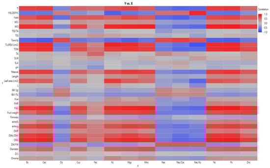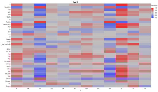 In the heatmap produced from the correlation between physiological–organoleptic plant growth characteristics and the nutrient content of the AGPM it is clear that all nutrients were positively related to the yield, mean fruit weight, and Extra fruit weight, except for Cl and Na, which were negatively related (Figure 5).