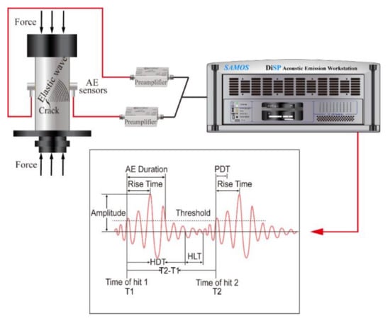 Schematic typical AE experiment and AE signals. The setting of the Peak Definition Time (PDT) ensures correct identification of the signal peak for rise time and peak amplitude measurements. If the PDT is smaller than the rise time, the amplitude captured by AE system would be smaller than the truth value. Proper setting of the Hit Definition Time (HDT) ensures that each AE signal from the structure is reported as one and only one hit. If the HDT is larger than (T2-T1), hit 1 and hit 2 will be detected by AE system as just one hit. AE system needs HLT to get ready for the next signal detection, with proper setting of the Hit Lockout Time (HLT), spurious measurements during the signal decay are avoided and data acquisition speed can be increased.