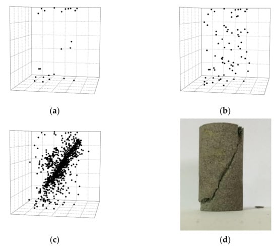 Evolution of AE centers. (a) A few AE centers appear in the top and bottom areas of a sandstone sample since friction between sample faces and loading faces; (b) some AE centers occur randomly; (c) AE centers form the final crack; and (d) the image of the cracked sample. Reproduced with permission from [54]. De Gruyter, 2016.