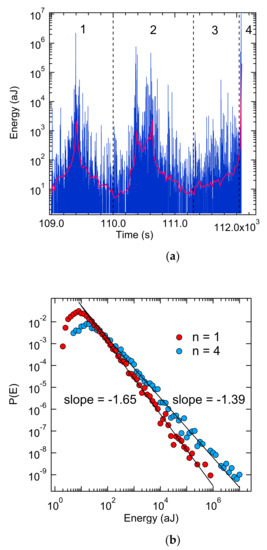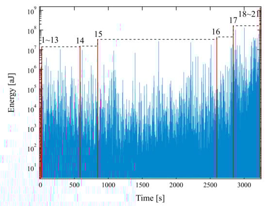 Jiang and his coauthors proposed the use of superjerks (also called “record breaking” events) to analyze AE spectra [59]. A superjerk is defined as an avalanche signal with energy greater than any previous event of the series. It has attracted great attention due to its relevance for climate and earthquake research [60,61,62]. Superjerks divide the whole AE spectrum into many subintervals (Figure 4). By analyzing the probability density distribution of AE energy in each subinterval, the critical exponent decreases with the increase in superjerk ranks, which can be used as a warning signal of impeding disasters (Figure 5). At the same time, it is also found that the waiting time intervals at times close to the final collapse become shorter and the AE signal strengths more intensive. The AE parameters hence evolve with the superjerk rank. A combination of these early warning signals was found to be the best approach to develop a reliable alarm system for structural collapse. Recently, a fiber bundle model has shown that the statistics of records of the event series of breaking bursts provide a very good tool to detect the acceleration breaking bursts, which could be used as an early warning of an imminent catastrophic failure [63]. Similar results have also been reported during soft uniaxial compression of three silica-based (SiO2) nanoporous materials. The variations in the activity rate are sufficient to explain the presence of multiple periods of accelerated seismic release leading to distinct brittle failure events [64].