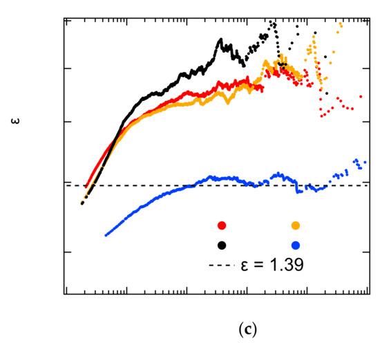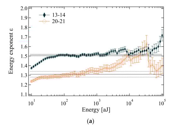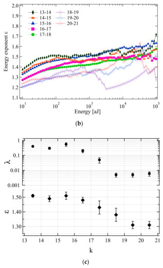 Energy exponent as a function of the lower energy cut-off determined by maximum likelihood (ML) estimate. (a) Energy exponents determined by the maximum likelihood method for k-intervals 13–14 and 20–21 with error bars and estimate values; (b) energy exponents for all intervals between k = 13 and k = 21. Sparse data sets lead to a less defined plateaus. We used data near 103 aJ to determine the energy exponents. (c) Evolution of the waiting time renormalization factor λ and the energy exponent ε with increasing rank k of superjerks. Two plateaus can be distinguished for large and small λ and exponents near ε = 1.5 and ε = 1.32. Reproduced with permission from [59]. American Physical Society, 2017.