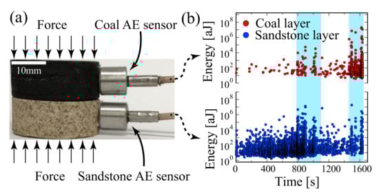 (a) Experimental arrangement for high stress measurements. (b) Energies of AE hits, detected by the transducers attached to coal and sandstone as indicated by their color as function of time. This experiment contains 1001 events in coal, and 4875 events in sandstone. The shadowed areas indicate time intervals from 790 s to 1100 s and from 1460 s to 1635 s. Reproduced with permission from [71]. American Physical Society, 2019.