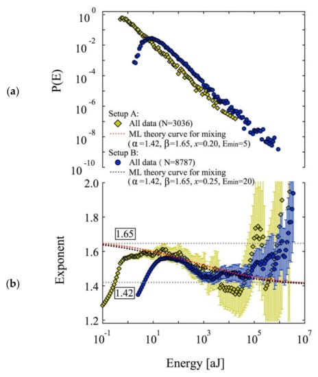 Log–log histogram of energy distributions (a), and ML analysis of the power law exponent as a function of a moving threshold (b) for sandwiches of sandstone and coal. ‘Setup A’ indicates low stress measurements, ‘Setup B’ high stress measurements. Reproduced with permission from [71]. American Physical Society, 2019.