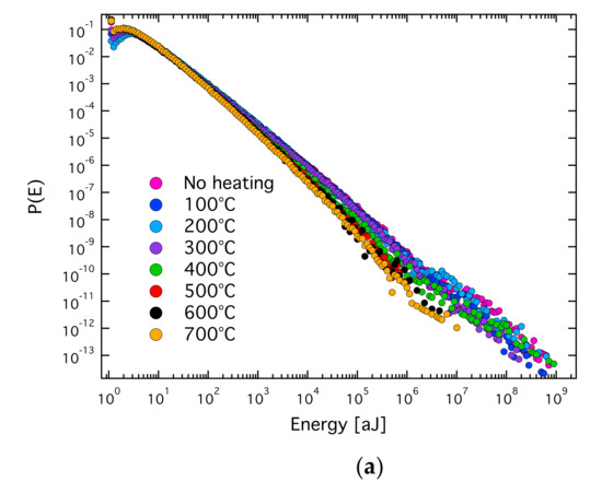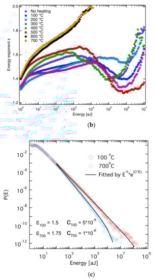 (a) Distribution of avalanche absolute energies for different temperatures. (b) The ML-fitting exponent ε as a function of a lower threshold Emin. (c) Damping and pure power fitting for the distribution of avalanche absolute energies of 100 °C and 700 °C. Reproduced with permission from [72]. De Gruyter, 2019.