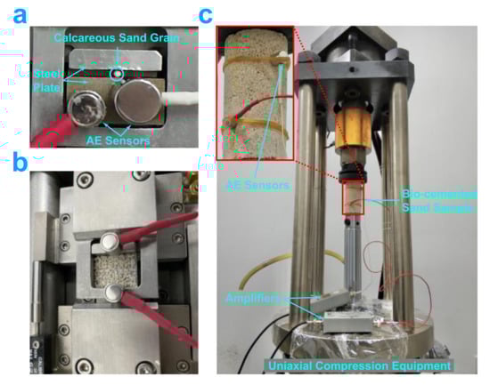 The energy consumption to produce cement for building work is particularly high. The cement industry creates significant environmental pollution, so that the development of new environmentally friendly cementitious materials has become a research hotspot in many countries. Some micro-organisms produce calcium carbonate in the process of metabolism, which induce calcium carbonate deposition during cementation [75,76]. One of the important applications is in the construction of calcareous sand islands and reefs. Calcareous sand exists widely throughout the Earth’s tropical zones. The main construction requirement is that calcareous sand needs to be reinforced for foundation construction. Wang et.al. carried out compression failure experiments on single calcareous sand grain, unconsolidated sands and biocemented sand block [77] (see Figure 9). All three materials show avalanches under compression. Through the analysis of the avalanche characteristics of the three samples, it was found that the destruction mechanism of the biocemented calcareous sand is the failure of the bonding between sand particles via the biogenic calcium carbonate. Under stress the biocemented calcareous sand blocks degenerate rapidly back into sands without cementation and some carbonate clusters. In this case, the observation of crackling noise provides an excellent indicator for the stability of biocemented structures.