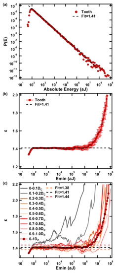 Teeth are the strongest part of the human body. They not only have the function of chewing, but also play an important role in pronunciation and facial appearances. They also contain microcracks which are not routinely found by optical and CT examination in dental clinics. This leads to wrong diagnosis of crack formation before the cracks become large enough to be observed optically. Moreover, tooth cracks do not self-repair, they can induce periodontitis and, ultimately, the loss of the tooth. The cracks do not induce pain at the initial stage, making it difficult for patients to detect tooth damage. When pain occurs, the best opportunity for treatment has already been missed. Wang et al. used healthy human molars to carry out damage examinations and found that the process of tooth cracking displays obvious avalanche characteristics [78]. Human teeth are composed of hydroxyapatite from a nanometer to a micrometer scale and are typically brittle. Cracks progresses through the tooth dentin pores, and exhibit abundant microstructures such as crack bridging, crack deflection and crack bifurcation. This complex crack evolution leads to avalanche dynamics. The stress–strain curve is a typically serrated with clustering of the acoustic emission signal. The absolute energy of AE meets the power-law distribution over nearly seven energy decades with a power-law exponent ε = 1.4, Figure 10. The statistical distributions of signal amplitudes, durations, correlations between energies and amplitudes, and the relationship between amplitude and duration all meet the prediction of mean field theory very well. These avalanche signals do not appear when the tooth is undamaged so that the acoustic emission method is a warning of developing microcracks in teeth.