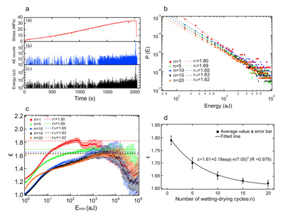 (a) AE spectra corresponding to stress curve in damaged sandstone. (b) The AE energies distribution of sandstone samples with different number of wetting–drying cycle in log–log scale. (c) the ML-fitting curves as a cutoff Emin, the plateau value is consistent with the slope in log–log scale. (d) the relationship between the energy exponent and the number of cyclic wetting events. Reproduced with permission from [82]. Springer Nature, 2018.