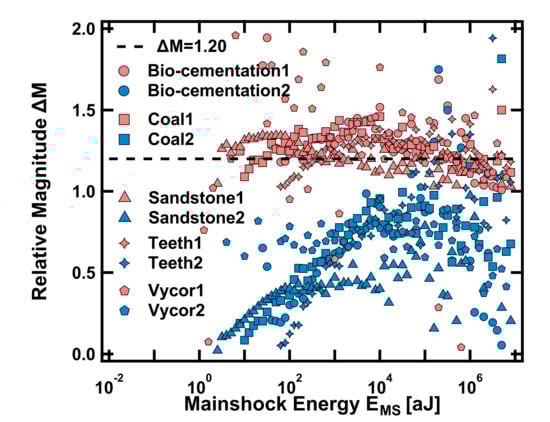 Båth’s law has been studied in previous coal, sandstone, teeth, Vycor glass, and biocemented sands compression acoustic emission tests [54,78,79], but after carefully calculation code checking, we found that there was an error in the calculation of Båth’s law. The method of selecting aftershocks in these previous studies [54,78,79] is to start from the defined main shock and compare the energy values between the subsequent signals and the main shock one by one along the time axis until a signal cut-off point larger than the main shock is found, and a new signal sequence is formed. The largest AE signal in this sequence is defined as the largest aftershock. The correct definition of relative magnitude should be ΔM = log10(EMS/EAS*), but the calculation code is incorrectly written as ΔM = log10(EMS)/log10(EAS*), EMS and EAS* are the energy of main shock and the largest aftershock normalized by 1 aJ which is approximately the minimum detectable energy. Figure 14 shows the comparison results of Båth’s law of different samples calculated by two formulas. Blue is the correct Båth’s law result and red is the ratio result of the incorrect calculation. There are three points to be pointed out. First, why does the correct Båth’s law formula not yield a result of 1.2? Secondly, the results of Båth’s law indicate that the relationship between the main shock and the largest aftershock is independent of the magnitude of the main shock, but the results of Figure 14 show that the Båth’s law analysis does not show a constant index in the low energy range. Thirdly, why does the wrong formula achieve better results than the correct one and what does it represent? These problems may be caused by the choice of the largest aftershock. The influence of time is not considered in this selection scheme, which may lead to the result that the so-called largest aftershock may be far away from the main shock: and indeed, the so-called ‘largest aftershock’ is registered as an independent event rather than as an aftershock. Its energy is not different from the previous main shock, which results in the small relative magnitude of the aftershock. This effect is more obvious in the low energy range because of the limited statistics of the potential aftershocks. Therefore, it is very important to improve the way to select the relevant aftershock to correctly analyze Båth’s law in acoustic emission tests. We are conducting further work to combine information from Omori’s law and the Båth’s law to explore whether a better analysis of aftershocks is possible.