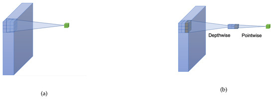(a) Standard convolution. (b) Depthwise separable convolution (adapted from [3]).