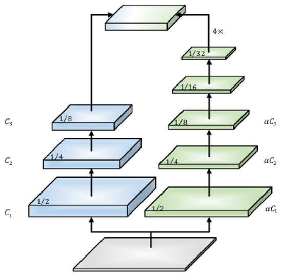 The trade-off between accuracy and inference time, has been addressed using two-branch networks: the one branch captures spatial details and generate high-resolution feature representation, while the other branch obtains high-level semantic context. Two-branch networks manage to achieve a beneficial balance between speed and accuracy because one of the two pathways is used to be a lightweight encoder of sufficient depth and the other pathway is a shallow, still wide branch consisting of a few convolutions [14,15,16]. At the same time, unlike the encoder–decoder architecture, two-branch networks preserve partial information that is lost after downsampling operations [16]. A standard two-branch network of [15] is shown in Figure 5. Overall, the proposed approach relies upon a lightweight architecture which achieves efficiency that is coupled with the possibility of both low- and high-level features representation learning that results in improved effectiveness.