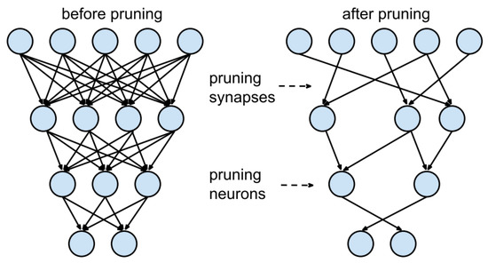 In weight pruning, individual parameters (connections), and hence the weights, are being removed, generating a sparse model that preserves the high-dimensional features of the original network. The work of [18] suggested weight pruning with a three-step method in which first the network is being trained to learn important connections. In the second step, unessential connections are being pruned. Lastly, the network is trained again to fine-tune the weights of the remaining connections. This way, network pruning can reduce the number of connections by to without reducing its effectiveness [18,19].