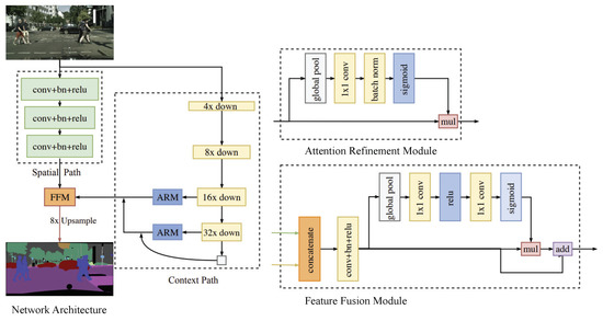- Yu, C.; Wang, J.; Peng, C.; Gao, C.; Yu, G.; Sang, N. BiSeNet: Bilateral Segmentation Network for Real-Time Semantic Segmentation; Computer Vision–ECCV 2018; Ferrari, V., Hebert, M., Sminchisescu, C., Weiss, Y., Eds.; Springer International Publishing: Cham, Switzerland, 2018; pp. 334–349. [Google Scholar]