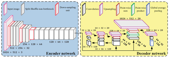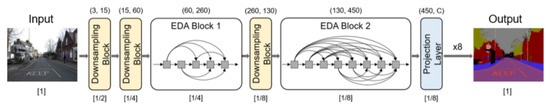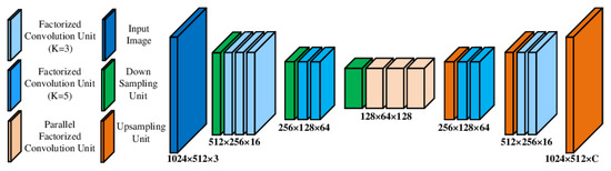 ESNet [32] follows a symmetric encoder–decoder architecture, as shown in Figure 13. It involves a parallel factorized convolution unit module with multiple branch parallel convolutions, multi-branch dilated convolution and pointwise convolutions. The symmetry of ESNet’s architecture reduces network’s complexity and as a result leads to a reduction of the inference time. The parallel factorized convolution unit module with multiple branch parallel convolutions manage to learn imparallel feature representations in a powerful manner, without increasing the computational complexity.