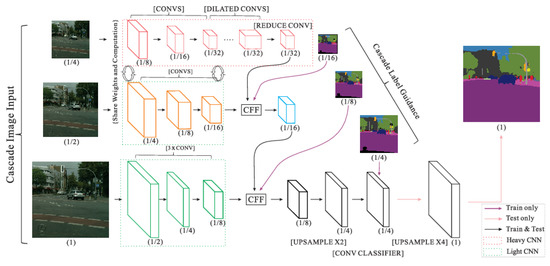 ICNet [34] proposes a framework for saving operations in multiple resolutions and features a cascade feature fusion unit. Its architecture is shown in Figure 15. It processes, simultaneously, semantic information from low resolution branches, along with details from high-resolution images in an efficiently manner.