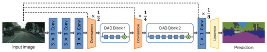 DABNet [39] introduces a Depthwise Asymmetric Bottleneck module, which extracts combined local and contextual information and reduces the number of parameters of the network. This specific module uses depthwise asymmetric convolution and dilated convolution. DABNet is build on the idea of creating a sufficient receptive field which aids to the dense use of the contextual information. DABNet’s design, shown in Figure 18, achieves an efficient and accurate architecture with reduced number of parameters compared to other real-time semantic segmentation models. It is of high importance to note that DABNet uses convolution factorization by choosing depthwise separable convolutions to speed up and inference time. DABNet presents 70.1% mIoU on “Cityscapes” test set, involving solely 0.76 million parameters, and can run at 104 fps on 512 × 1024 high-resolution images.
