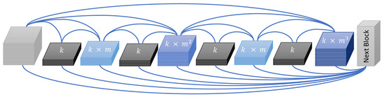 HarDNet [42] introduces dynamic random-access memory traffic for feature map access and proposes a new metric, Convolutional Input/Output. It also features a Harmonic Dense Block and depthwise separable convolution. HarDNet also states that inference latency is highly correlated with the DRAM traffic. HarDNet achieves a high accuracy-over-Convolutional Input/Output and a great computational efficiency by improving the computational density (MACs (number of multiply-accumulate operations or floating-point operations) over Convolutional Input/Output). HarDNet’s architecture is shown in Figure 21.