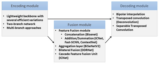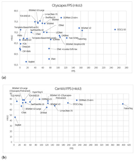 In this Section, we present the current state-of-the-art models of real-time semantic segmentation, based on their performance in terms of accuracy and inference time for “Cityscapes” and “CamVid” datasets. In our presentation, we follow a grouping of the models based on the approaches that have been used to achieve efficiency.
