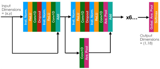 As mentioned previously, the ResNet neural network architecture was used for classification. A diagram of this approach is shown in Figure 1. ResNet is a deep learning architecture that uses residual connections in a cascaded network to allow for efficient training of large, deep convolutional networks [8]. Additional fundamentals of deep learning can be found in research from LeCun et al. [9]. Various layers in the ResNet architecture give a variety of benefits to this application. For instance, the convolutional layers provide a translational invariance to the classification process, which allows the features of interest to drift in the domain in which they are processed without classification performance degrading. The translational invariance is valuable for UCE data obtained via NILM because many of the devices (especially COTS devices) are stable in their operation only to within some commercially acceptable tolerance and are likely to drift in their characteristics over time (this is especially evident for UCE characteristics in the frequency domain position, which became of particular interest in this investigation).