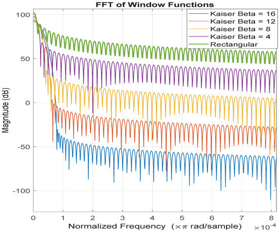 The five window types used in this comparison are rectangular/uniform and Kaiser . The FFT of each of the window functions is given in Figure 2.