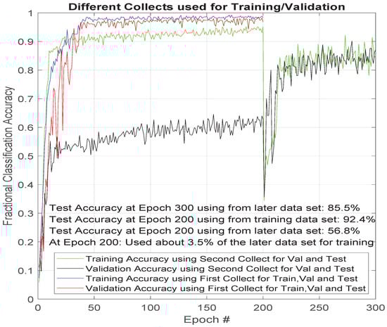 At epoch 200, the authors began training the ResNet classifier with a very small set of data from the second collection period, which substantially helped the performance of the validation and test of the classifier as measured by the classification accuracy. The amount of data used in the training was only approximately 1 out of 30 of the available data segments from the second collection for each device.