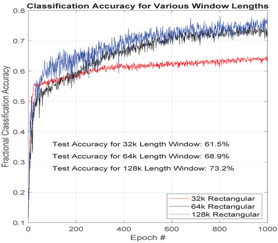 where represents the time-domain samples being windowed and represents the windowing coefficients being applied. This window application is performed over a finite interval length N. Since increasing N results in higher resolution in the frequency domain, one set of experiments varying N was performed to determine the effects of the additional spectral resolution. Increasing spectral resolution should improve classification results until the resolution exceeds the spectral width of the features determined by the classifier. The noise floor also drops about 3 dB for each doubling of the value of N. On the down side, larger values of N results in lower resolution in the time-domain. Therefore, an important assumption in this trade-space evaluation and feature hypothesis generation (limited explainability attempt for the ResNet classifier) is the assumption that N will not be chosen to exceed the short-term stationarity of the features and noise being used for classification of the devices. A rectangular uniform window was used for the window length experiment. The amount of data used for training, validation and testing was the same regardless of the window length used (smaller window lengths produced more machine learning samples).