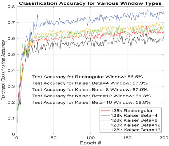 Figure 6 shows classification results as a function of training epochs for five different FFT window types. Knowing the attributes of the tested window types and the performances recorded in Figure 6, provide additional understanding of features of the data set are most important to the ResNet classifier.