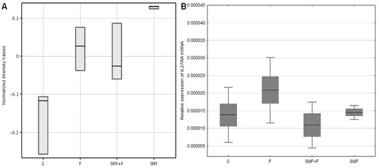 Expression of the IL27RA gene in control cells (C), F−-treated cells (F), cells that had been exposed to a static magnetic field (SMF), and cells that had simultaneously been exposed to a static magnetic field and F− (SMF + F) that was determined using the oligonucleotide microarray technique (A) and the RT-qPCR technique (B). The results are presented as the mean ± SE (box) and SD (whisker).
