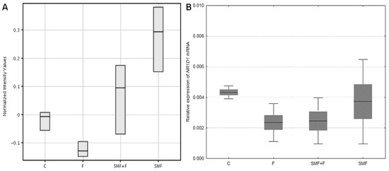 Expression of the NR1D1 gene in the control cells (C), F−-treated cells (F), cells that had been exposed to a static magnetic field (SMF), and cells that had simultaneously been exposed to a static magnetic field and F− (SMF + F) that was determined using the oligonucleotide microarray technique (A) and the RT-qPCR technique (B). The results are presented as the mean ± SE (box) and SD (whisker).