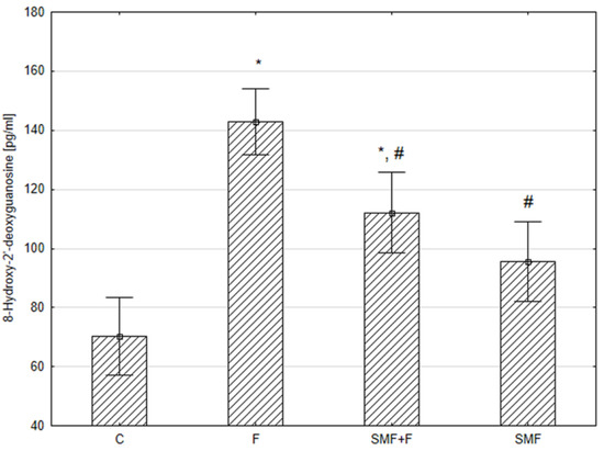 The DNA/RNA oxidative damage marker concentration in the control cells (C), F−-treated cells (F), cells that had been exposed to a static magnetic field (SMF) and cells that had simultaneously been exposed to a static magnetic field and F− (SMF + F). The results are presented as the mean ± SD; statistical significance: * p < 0.05 vs. C; # p < 0.05 vs. F.
