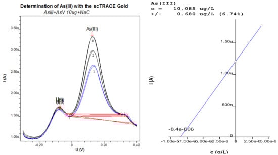Differential pulse anodic stripping voltammetry (DPASV) was used to evaluate the sensitivity for arsenic analysis and speciation of groundwater. The DPASV voltammograms of As(III) for a 10 μg L−1 standard solution with the addition of NaC with scTRACE Gold electrode are shown in Figure 1.